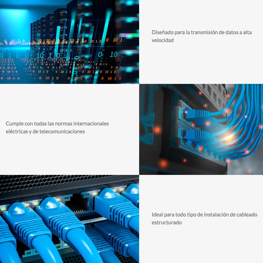 Cable UTP diseñado para la transmisión de datos a alta velocidad. Diseñado para sostener transmisiones de velocidad de hasta 1Gb por segundo y un desempeño fiable en frecuencias de 250 Mhz. Fabricado con 4 pares trenzados de cables hechos de cobre y aluminio con calibre 24 AWG y protegido con revestimiento de polietileno de alta densidad. Cumple con las normas internacionales CE y RoHS. Cumple con todas las normas internacionales. Ideal para todo tipo de instalación de cableado estructurado.