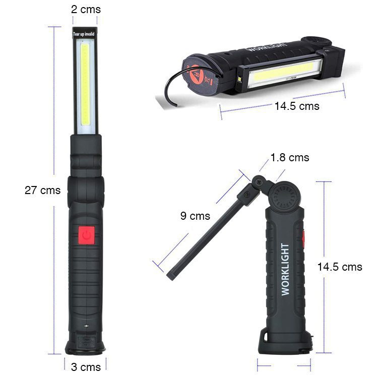 Esta linterna led de trabajo es una infaltable en cualquier trabajo técnico y/o mecánico y también para tener si o sí entre las herramientas de tu automóvil u hogar. Esta linterna posee ajusta en 360 grados, es plegable y además cuenta con 5 modos de luz diferente: Led frontal, lámpara led luz media, lámpara led luz alta, luz led roja y luz flash color rojo. Para convertirla en luz roja, sólo basta mantener presionado por 3 segundos el botón on/off. Además, su base posee un imán, que te permite sujetarla en superficies metálicas, además de un gancho para colgarla.