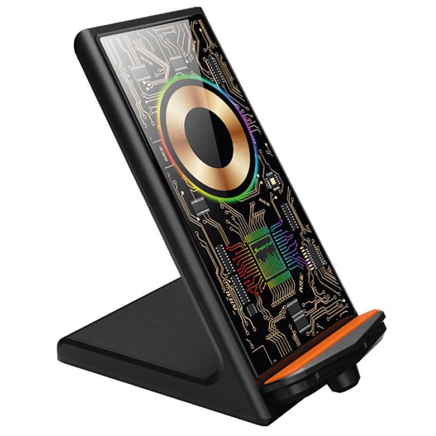 Cargador inalámbrico celular Bestlink, modelo BL-CHW15, con tecnología de carga con lente de vidrio. Diseño con soporte.
