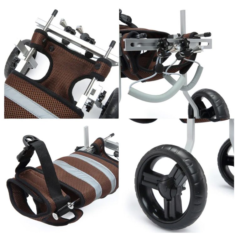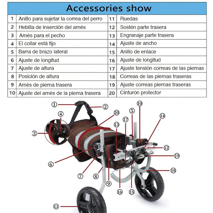 Esta silla de ruedas está hecha para perros con poca o nula movilidad de sus patas traseras. Posee ajustes en altura y ancho y está hecha de cuerpo de aluminio, con ruedas traseras de goma de 13 cms de diámetro. Además posee arnés delantero y faja central, para una mejor sujeción.