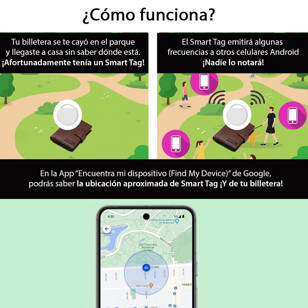 Cuando abres tu aplicación “Encontrar mi dispositivo (Find My Device)” para buscar tu Smart Tag, la aplicación le pregunta a Google: “¿Hay alguna noticia de mi Tag?”.Google revisa todos los reportes anónimos que ha recibido de los otros teléfonos Android y te muestra en el mapa la ubicación del último teléfono que “escuchó” a tu Smart Tag.